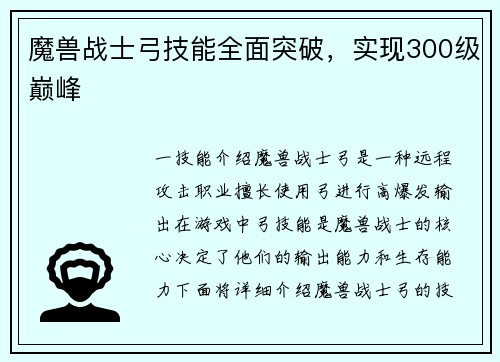 魔兽世界宠物对战游戏的背景介绍 魔兽世界是一款大型多人在线角色扮演游戏,玩家可以在游戏中扮演各种种族的角色展开冒险。除了主线任务和PVP玩法外,魔兽世界还提供了丰富多样的宠物对战系统。宠物对战游戏允许...